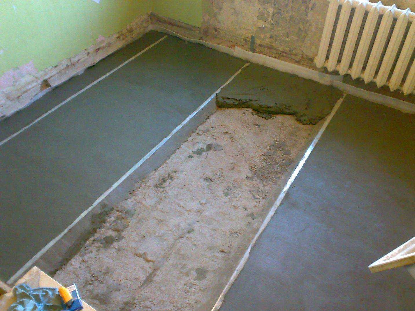 Для облегчения заливки бетона и выдержки «нулевого» уровня следует выполнить укладку направляющих. Для этого нужно произвести разметку помещения, отделив направляющими помещение на отрезки шириной до 2 метров