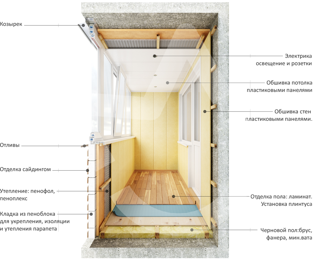 - Все поверхности, которые можно утеплить снаружи (и стены, и потолок). Если это первый этаж, и под балконом вы сделали пристройку с подвалом, то есть возможность еще и утеплить пол (прикрепить утеплитель снизу, на потолок подвала). Чем толще будет слой утеплителя, тем лучше. Поскольку на балконах редко делаются жилые/рабочие помещения, то достаточно будет использовать слой в 5-10 см см.