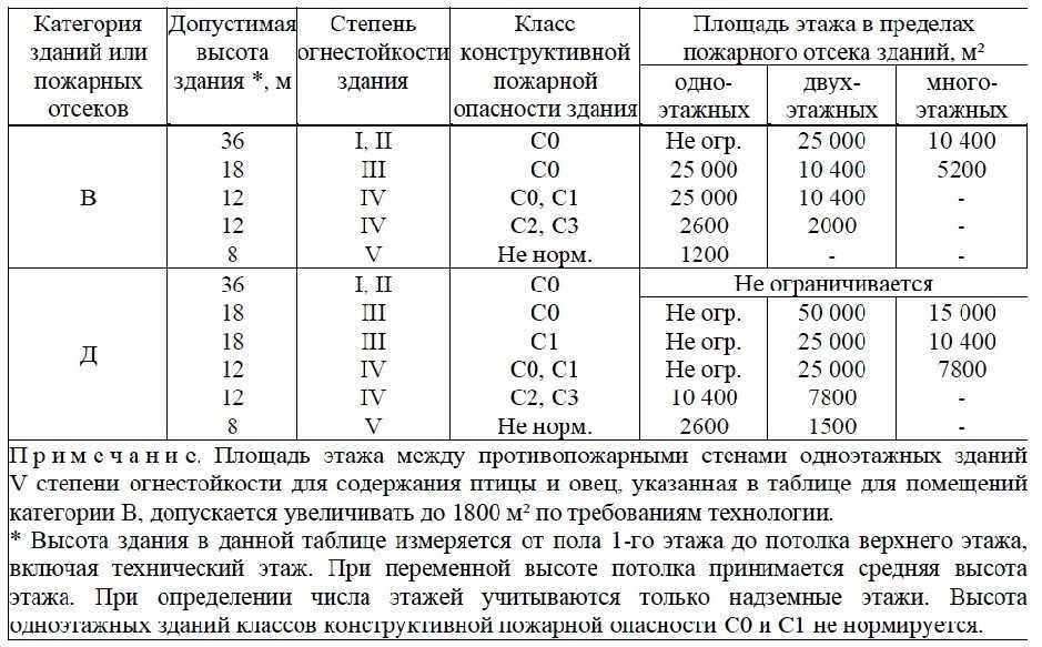 | Категория огнестойкости | Уровень практической пожароопасности здания | Максимальная допустимая высота | Площадь пожарного отсека |
