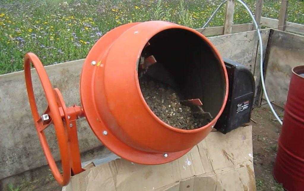 - Установить бетономешалку на ровную площадку или специально сформированный помост. Смазать стенки устройства смесью воды, цемента и песка, чтобы уменьшить прилипание бетона. Если нет возможности обработать смеситель, то следует увеличить долю песка и цемента для первой партии бетона (достаточно 10%).