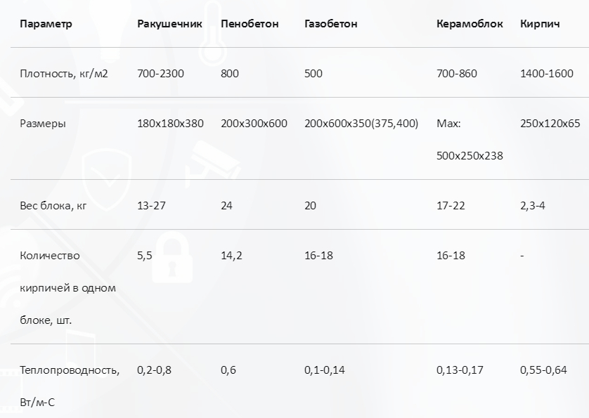 В заключительной таблице указаны основные характеристики блоков из ракушки. Как видно, стройматериал не уступает по качеству другим блокам: пенобетону, газобетону, керамоблоку.