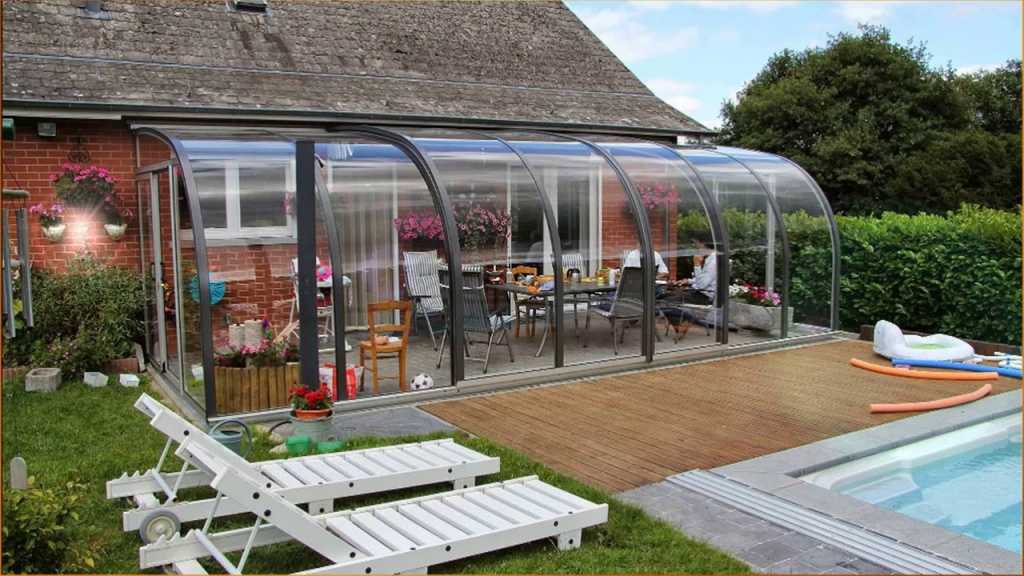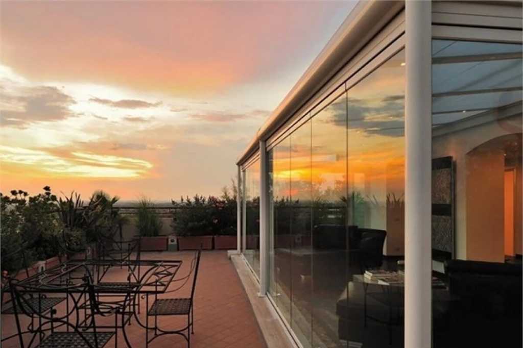 Терраса с раздвижной стеной из полимерного профиля имеет строгий, презентабельный вид. Из ПВХ изготавливают как «холодные», так и «теплые» системы.