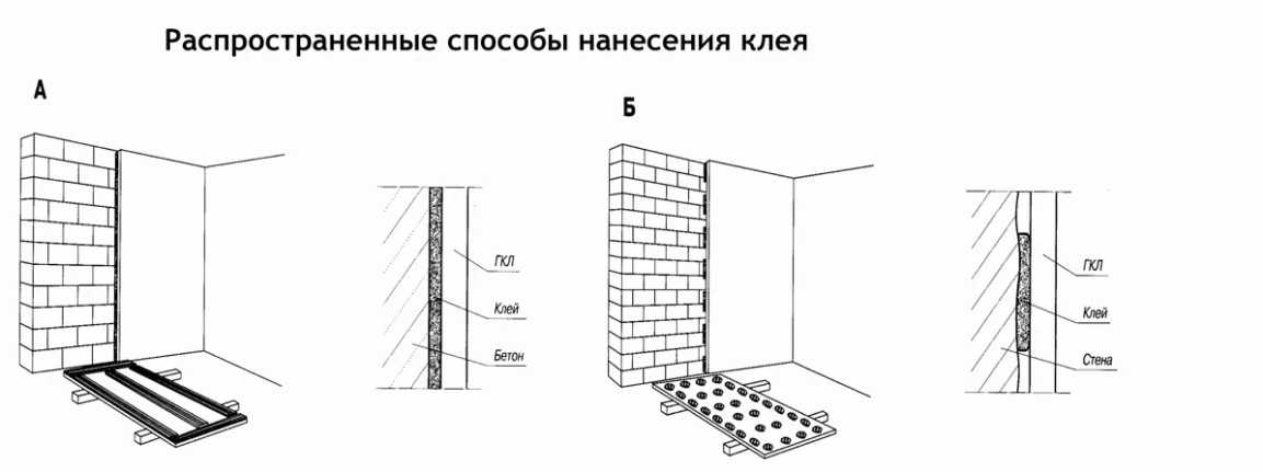 При выравнивании стен клеевым способом на листы толщиной 12,5 мм наносят одну продольную полосу клея по центру (не считая периметра), а на лист 9,5 мм необходимо минимум два ряда.