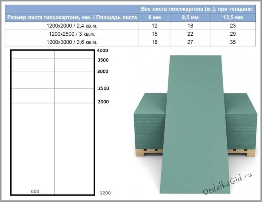 Более точную информацию уточните в магазине, в котором планируете приобретать материал. Гипсокартонный лист — материал достаточно хрупкий, его легко сломать или повредить. Для комфортного ремонта или строительства необходимо соблюдать несколько советов:. Размеры гипсовых листов Вес ГКЛ связан с его площадью и толщиной. Во всём мире существуют общепринятые стандарты габаритов: Длина — от 2 до 4 м.