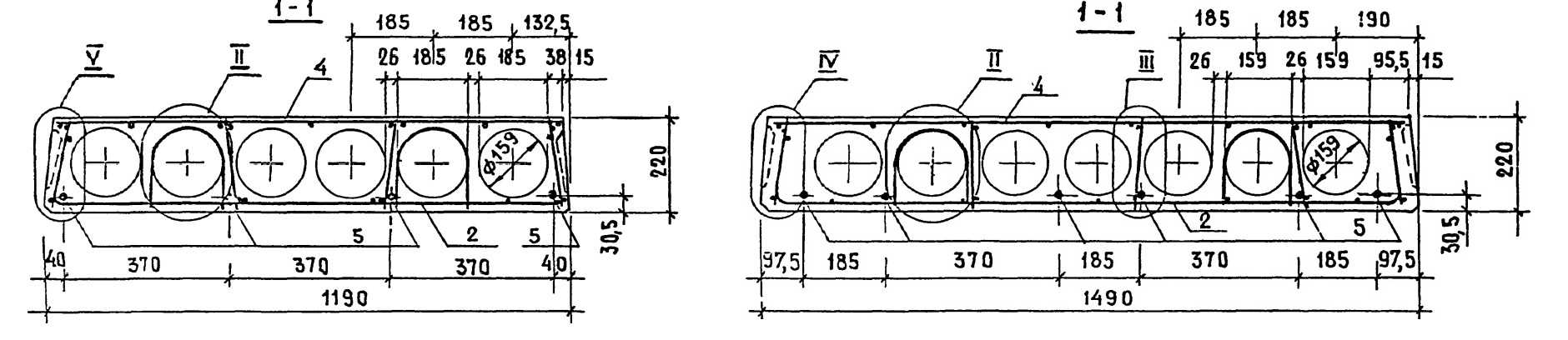 - 1ПК (ПК) — плита перекрытия толщиной 220 мм с круглыми пустотами диаметром 159 мм, для опирания по двум сторонам;