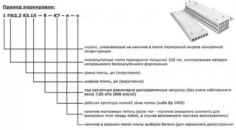 Выбрать подходящие изделия можно согласно основному назначению. Если конструкция может иметь несколько типоразмеров, буквенное обозначение может быть дополнено цифрой. Следовательно, для железобетонных плит перекрытий с круглыми пустотами маркировка изделия будет начинаться с «ПК», монолитные конструкции «П», остальные обозначения расшифруем далее.