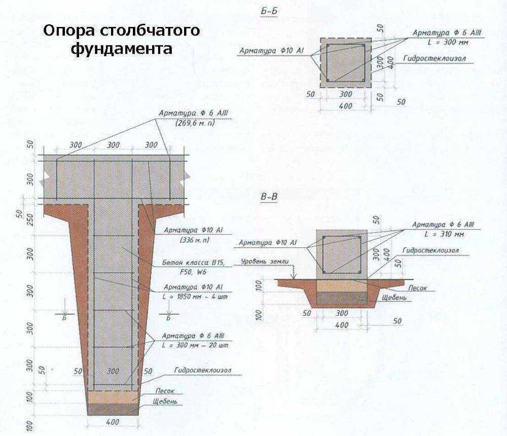 Столбчатое основание в виде железобетонных опор обладает большей несущей способностью и надежностью, что достигается за счет монолитной конструкции и армирования. Для его устройства подготавливаются канавы определенного размера, в которых делается песчаная подушка и устанавливается армирующий каркас из рифленой арматуры. Выше уровня земли делается опалубка из обрезной доски или фанеры. Финишный этап – заливка бетоном.
