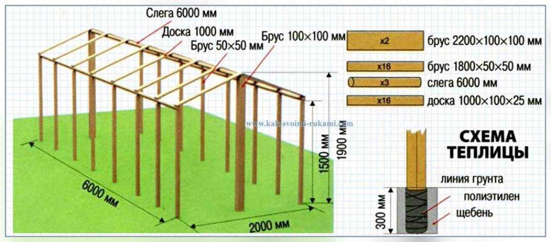 Устройство свай производится согласно приготовленной ранее схеме будущей теплицы.