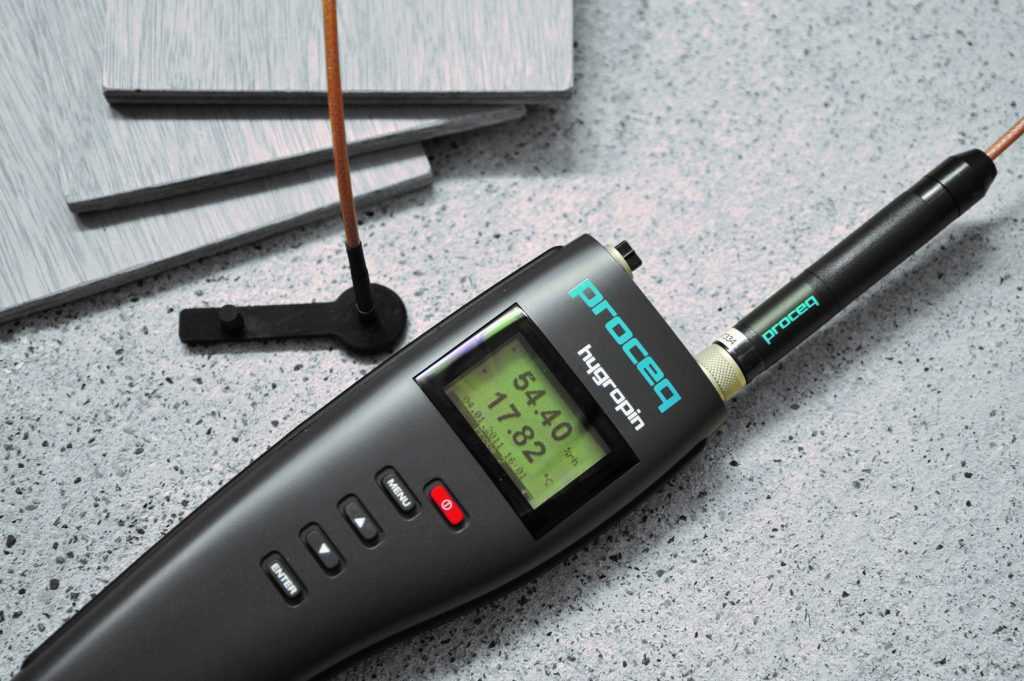 Электронный влагомер. Стандартное бытовое метрологического оборудование, которое можно купить практически в любом строительном магазине. Простой интерфейс и информационный дисплей позволяют легко опередить концентрацию водяных паров в структуре стяжке нажатием одной кнопки.