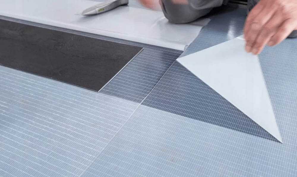 Для облегчения укладки некоторые производители снабжают кварцвинил самоклеящейся основой. В этом случае для монтажа достаточно снять с материала защитную пленку и плотно прижать его к основанию.