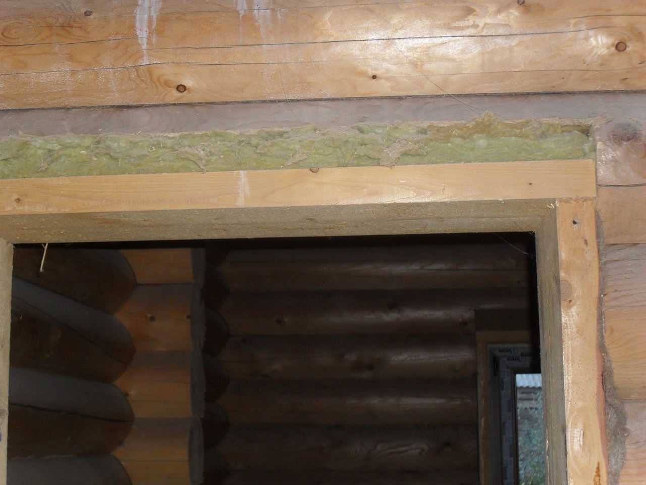 А чтобы обсада могла свободно перемещаться, используют рулонный межвенцовый утеплитель, которым обкладывают шипы. Этим же утеплителем затем заделывают верхний компенсационный зазор между проёмом и обсадой (около 4-5 см).