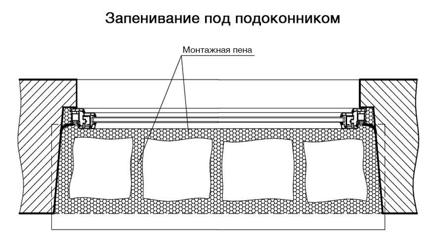 Зазоры между стеной и рамой запениваются монтажной пеной. Пена выполняет как изоляционную функцию, так и является крепежным элементом. От качества выполнения этого этапа монтажа во многом зависит общий результат