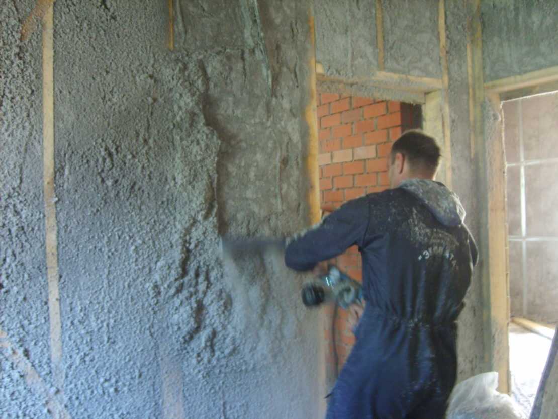 - Мокрый способ. Клеящим наполнителем в этом варианте служит лигнин. Влажные волокна хорошо прилипают к любой основе. Слой утеплителя должен быть в пределах 50-60 кг/куб.м. Этим методом хорошо утеплять блочные или кирпичные стены. Обрешетку изготавливают из бруса или профиля (первый вариант предпочтительней). Утеплитель наносят с помощью профессиональной установки. Рыхлую вату на самом выходе у сопла пропитывают водой и под напором выдают на поверхность. Мокрый способ – легкий и быстрый, незаменим при больших объемах. Недостатком можно считать только наличие профессиональной техники. Для сложных поверхностей типа потолка с нижней стороны в воде для прочности растворяют клеящие составы, помогающие линину усилить прилипание. Избыток срезают по уровню и после просушки используют повторно. Собственно, отходов не бывает при любом варианте монтажа, так как вата подходит для повторного применения.