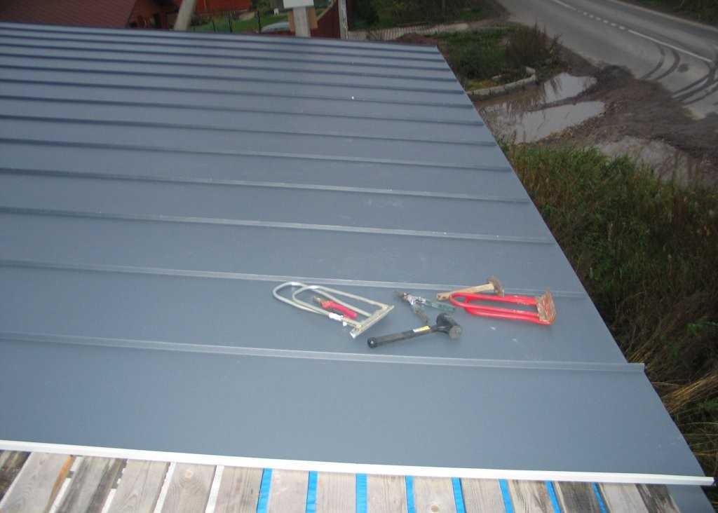 Далее идут кровельные работы, которые отличаются в зависимости от типа кровельного материала. В данном случае необходимо было решить проблему температурного расширения материала — оцинкованная сталь (пурал) при нагревании/остывании значительно изменяет свои размеры. Чтобы обеспечить свободу расширения крепить материал к обрешетке решено за фальц подвижными кляммерами со свободой перемещения 15-20 мм.