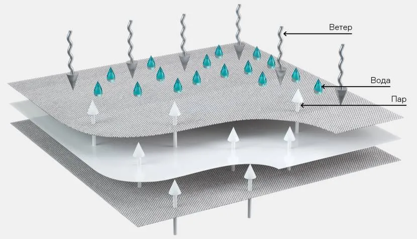 Внешний тканый слой («спанбонд») обладает достаточной прочностью, устойчив к УФ-излучению. Определяет текстуру, толщину, цвет пленки. Внутренний представляет собой микропористую мембрану. За счет минимального диаметра пор пленки пропускают молекулы водяного пара, но задерживает воду в жидком состоянии.