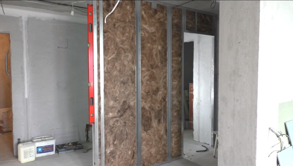 Между профилями при этом рекомендуется уложить слой минеральной ваты. Это поспособствует лучшей звукоизоляции. Хотя стена и так практически не будет пропускать шум, лучше перестраховаться и избавиться от полостей, в которых звук хорошо распространяется и резонирует. Сам усиленный каркас для гипсокартона с двойной обшивкой к тому же неплохо удерживает тепло внутри помещения. Укладку минеральной ваты лучше осуществлять после того, как одна сторона перегородки уже зашита листами: это значительно облегчит фиксацию наполнителя.