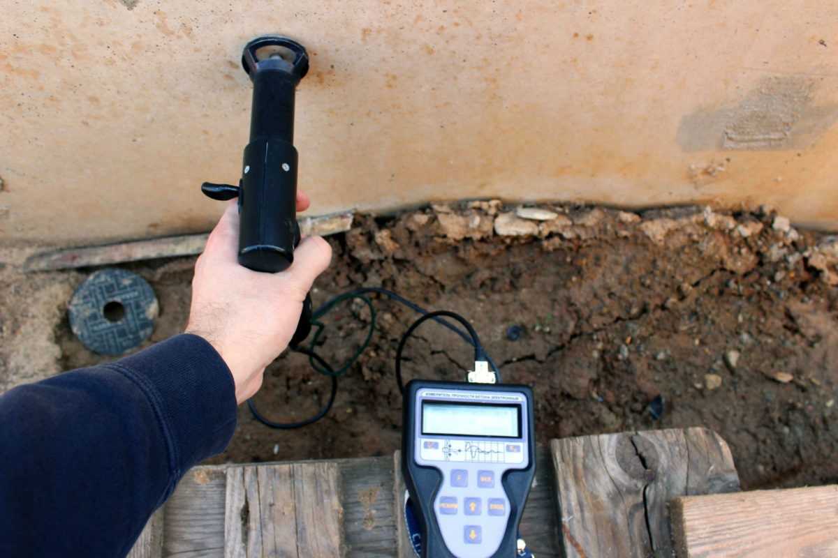 - Неразрушающий контроль — позволяет определить прочность бетона без механических воздействий на фундамент.