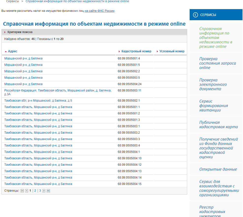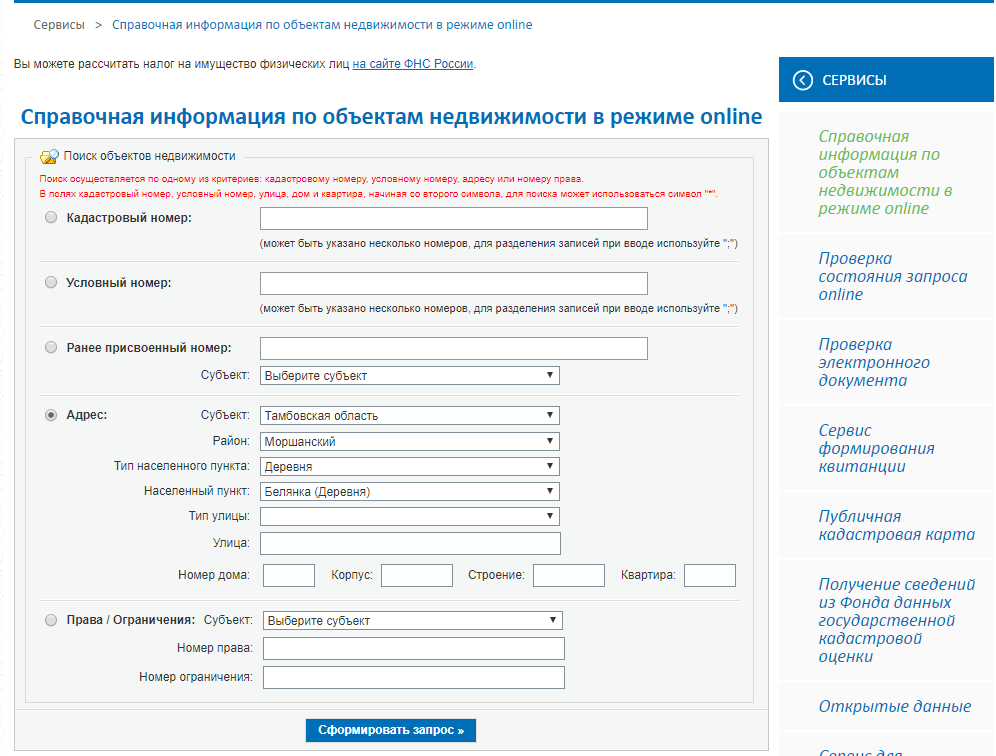 После этого нажмите на кнопку «Сформировать запрос». Если указать точные данные вплоть до номера дома, вы увидите ваш участок. Но если вы не помните точный адрес, можно указать субъект и населенный пункт. В результате вы увидите список участков, находящихся в выбранном населенном пункте.