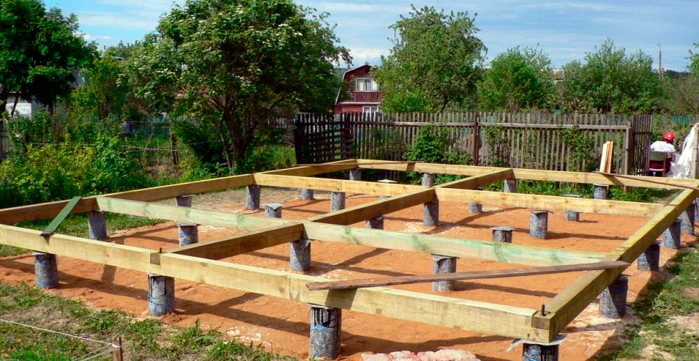 После укладки фундамента делается нижняя обвязка, монтируются напольные балки перекрытия и устанавливаются вертикальные стойки из тщательно просушенного и обработанного спецсоставами бруса. Затем монтируется верхняя обвязка, укладываются потолочные балки перекрытия, после чего возводится стропильная система.