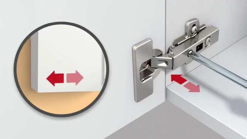 Этот вид настройки выполняют, когда между дверями образовался неровный зазор. Благодаря горизонтальной корректировке можно предотвратить трение торца одного мебельного фасада об кромку соседней створки. Такая регулировка дверей кухонных шкафов, тумб или шифоньеров также позволяет выставить крайние стороны фасадов по уровню с боковыми стенками корпусов мебельных предметов.