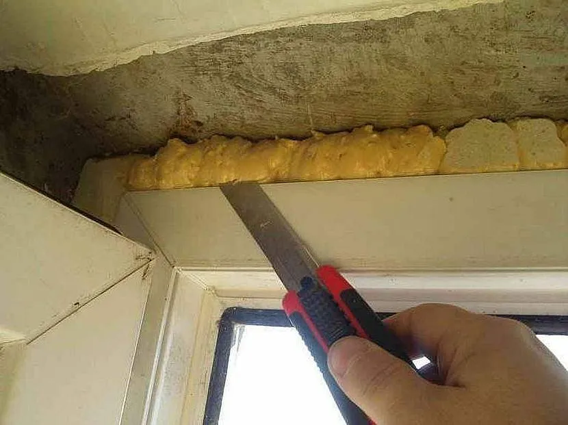 - Для начала потребуется избавиться от излишков монтажной пены. Если пена уже потеряла свои свойства, поскольку долгое время была под воздействием ультрафиолетовых лучей, её стоит зачистить, после чего заново запенить. Дайте полностью просохнуть, а затем уберите излишки.
