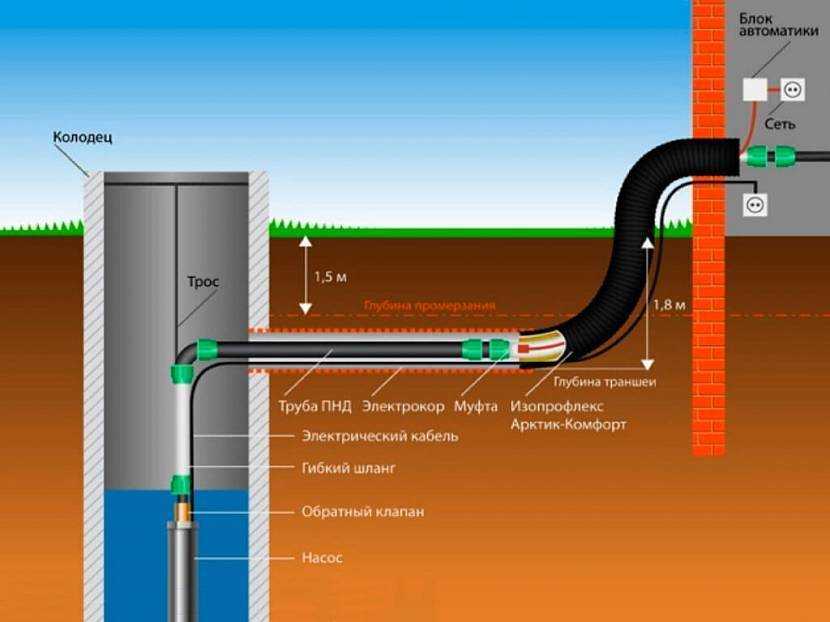 Если водопровод прокладывается от централизованного напорного источника, глубина канавы на всем протяжении может быть одинаковой. Если же источником служит автономный колодец или скважина с насосом, трассу прокладывают с небольшим уклоном в его сторону, чтобы в случае аварии вода не оставалась в трубах, а стекала обратно самотёком.